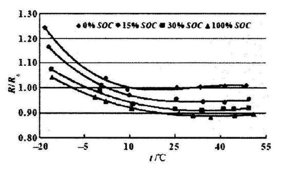 鋰電池溫度與電阻的關系,如下圖所示。不同的曲線代表電池自身不同的荷電量。任何一個荷電量下,電池內阻都隨著溫度的降低而明顯升高,荷電量越低的電芯,內阻越大,并且這個趨勢也隨著溫度的變化而保持不變。